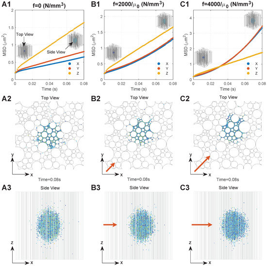 We monitored the diffusion behaviours of 50 nm MNPs under three conditions, namely, (no external magnetic field), , and , respectively, which are located in the practical ranges, since the maximum values of practically applied B, , and could reach 10 T, 100 T/m, and 200,000, respectively [38,39,40]; the values of 2000 and 4000 are within the application range. To focus on the impact of the external magnetic field, the geometry with was adopted. Figure 3(A1–C1) show the MSD of the MNPs under these three conditions as a function of time, respectively. To more clearly interpret the mechanism behind the curves, Figure 3(A2–C2,A3–C3) present the final distributions of the MNPs (t = 0.08 s) from the top view and side view of the computational domain.