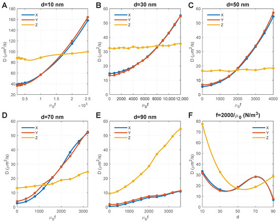 Effect of particle size and magnetic force density on the diffusion coefficients of MNPs. (A–E) show the results of MNPs with diameters of 10 nm, 30 nm, 50 nm, 70 nm, 90 nm, respectively. Note that MNPs with different particle sizes have different kinetic energies under the same magnetic force density; thus, different magnetic force densities were applied to MNPs with different particle sizes in order to capture the points where diffusion coefficients in the X and Y directions are equal to that in the Z direction. (F) Relationship between diffusion coefficients and particle size when the magnetic force density is .