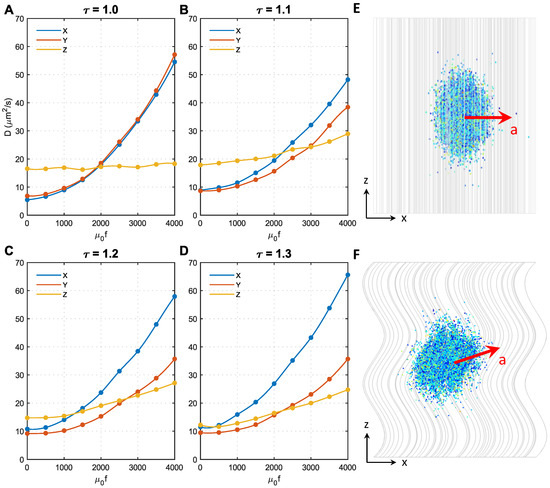 Initially, when , in all microstructures, but the difference significantly decreases with the tortuosity; when , are even comparable to , the approximately isotropic diffusion can be automatically achieved. The effect of becomes more complex after applying the external magnetic field. always holds for regardless of the magnetic force density. In contrast, increases faster with the magnetic force density compared to when . This is because only the MNP movement in the XY direction was accelerated when , as shown in Figure 5E, whereas the diffusion in the Z direction was less affected (see Figure 5A). However, when , as axons bend towards the X direction in the present microstructures reconstructed based on Figure 1 of Ref. [25], the MNPs can more easily change direction and move along the axon tracts when encountering resistance in the XY direction. Under this condition, the acceleration direction is in the XY direction, but slightly towards the Z direction, as shown in Figure 5F. This trend can be enhanced by either increasing resistance in the XY direction (i.e., acceleration introduced by higher f) or increasing . These findings explain why in Figure 5B–D increases with f and increases more sharply with . Furthermore, as axons bend towards the X direction in the reconstructed microstructures, the derivative Z acceleration has an X component; thus, . This effect is enhanced with tortuosity, hence the difference between also increases with tortuosity.