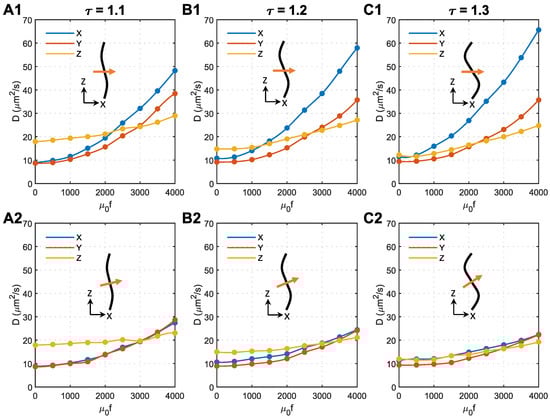 Effect of magnetic field direction on the anisotropy of MNP diffusion coefficients in the brain WM. (A1) Tortuosity = 1.1, the magnetic field is perpendicular to the Z direction. (A2) Tortuosity = 1.1, the magnetic field is perpendicular to the axons. (B1) Tortuosity = 1.2, the magnetic field is perpendicular to the Z direction. (B2) Tortuosity = 1.2, the magnetic field is perpendicular to the axons. (C1) Tortuosity = 1.3, the magnetic field is perpendicular to the Z direction. (C2) Tortuosity = 1.3, the magnetic field is perpendicular to the axons. In each subfigure, the black curve represents the axon shape, while the orange arrow shows the direction of the applied magnetic field.
