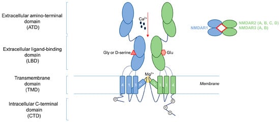 NMDA receptor structure. NMDAR is a heterotetrametric transmembrane receptor constituted by two obligatory NMDAR1 subunits and a further two NMDAR2 or NMDAR3 subunits. NMDAR subunits are characterized by an extracellular amino-terminal domain (ATD), an extracellular ligand-binding domain (LBD), four transmembrane domains (TMD), and an intracellular C-terminal domain (CTD). Ca2+: calcium; Gly: glycine; Glu: glutamate; Mg2+: magnesium.