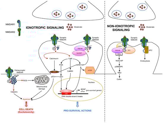 However, the signaling mediated by NMDAR is more complex as it depends on its localization at the synapse. A third of surface NMDARs are located extrasynaptically; the other two thirds are concentrated at the synaptic compartment []. Synaptic and extrasynaptic NMDARs activate different signaling, leading to opposite actions. Synaptic NMDARs are associated with neuronal survival in physiological conditions, whereas extrasynaptic NMDARs are notoriously involved in neuronal death during excitotoxicity []. The pro-survival action mediated by NMDAR is characterized by the involvement of different functions: protection from oxidative stress, inhibition of apoptosis by suppression of the pro-apoptotic p53, activation of the transcription factor CREB, and production of the pro-survival brain-derived neurotrophic factor (BDNF) []. In addition to the physiological function, Ca2+ influx is involved in excitotoxicity, which is due to the excess of glutamate release, at both the extrasynaptic and synaptic compartments, resulting in the over-activation of NMDAR and excessive entrance of Ca2+ in neurons []. Excessive Ca2+ influx triggers different pro-death mechanisms, such as calpain activation, reactive oxygen species (ROS) generation, mitochondrial damage, and cell necrosis or apoptosis. In addition, NMDAR is known to be an important regulator of mTOR signaling activity []. Specifically, NMDAR activation produces the rapid internalization of two isoforms of the cationic amino acid transporter, resulting in diminished amino acid transport into the cortical neurons. The nutrient sensors detect amino acid concentration and influence mTORCl activity. When amino acid concentration is low, mTORC1 activity is diminished. Ca2+ influx derived from NMDAR activation stimulates calcineurin, a phosphatase that, in turn, activates STEP []. STEP produces the dephosphorylation and inhibition of ERK1/2 (extracellular signal-regulated kinase), which is also a driver of mTOR signaling. Overall, these data indicate the existence of positive and negative loops in NMDAR ionotropic signaling.