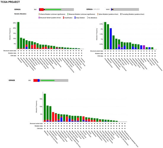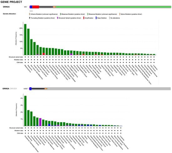 Clinical evidence regarding the role of NMDAR in cancer involves the genetic alterations, gene expression, and clinical correlation analyses of human tumor samples. Genome sequencing studies have identified over 10,000 coding mutations of GRIN genes in various types of cancer, with a large proportion of these variants being found in GRIN2A and GRIN2B (COSMIC, the Catalogue Of Somatic Mutations In Cancer, accessed on 20 January 2023, https://cancer.sanger.ac.uk). By querying the AACR Project GENIE (accessed on 20 January 2023, https://www.aacr.org/professionals/research/aacr-project-genie/; []) through the cBioPortal (accessed on 20 January 2023, https://www.cbioportal.org/; [,]), the GRIN2A gene was found to be altered (somatic mutations, copy number variation, and structural variants) in 4% of all cancers, with melanoma, bladder, lung, and colon adenocarcinoma having the greatest prevalence of alterations (Figure 5).