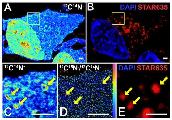 Example of correlating STED and NanoSIMS images for determining the 15N enrichment of SGs. (A) 12C14N− NanoSIMS image of a stressed cell showing the shape of the whole cell and nucleus. (B) STED image of the stressed cell. DAPI is labelled for nucleus (blue), and anti-G3BP antibody and secondary antibody STAR 635 are labelled for SG protein G3BP (red). (C–E) Zoomed-in images of the yellow box in (A,B); (C) 12C14N− NanoSIMS image; (D) 12C15N−/12C14N− NanoSIMS image; (E) STED image. The arrows point to the selected SGs. Scale bars are 2 μm.