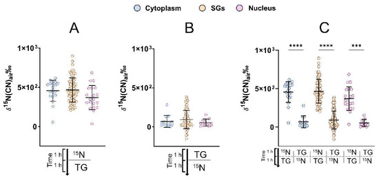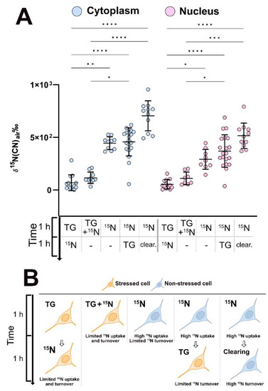Significant differences in the protein turnover of the cytoplasm and the nucleus were found between different treatments (Figure 2A). The cells that were stressed before (TG → 15N) or during (TG + 15N) the 15N leucine incubation exhibited significantly lower turnover in both the cytoplasm and nucleus compared to those in the unstressed cells. In fact, the turnover of the stressed cells nearly decreased to the 15N enrichment of 0. In addition, the protein turnover of the cells being stressed after the 15N leucine incubation (15N → TG) was at the same level as that of the unstressed cells. This shows that the cellular protein turnover is dramatically inhibited by stress from the moment the stress occurs. Moreover, for the unstressed cells, the incubation with 15N leucine followed by clearing time (15N → clear.) resulted in higher turnover, albeit not statistically significantly (Dunn’s, p > 0.05), than the one without clearing (15N). This is likely because the cells had more time to synthesize proteins and thus a higher amount of 15N was incorporated into the cells during the clearing time. Again, we hypothesize that this is due to the latter having had more time to incorporate the amino acids into proteins. The mean δ15N of the cells which were fixed immediately after 15N leucine incubation (15N) is significantly higher than that of those which were stressed before being incubated with the amino acid (TG →15N); thus, the effect of fixation is not comparable to the effect of stress in terms of lowering the amount of 15N in the cells. Lastly, the protein turnover of the cytoplasm is higher than that of the nucleus, although not statistically significant. This can be explained by a high amount of DNA, which contains CN which is not replaced by the 15N leucine. However, this relation is not seen in the stressed cells at the sensitivity of the NanoSIMS measurement in a range of ppb-ppm [31], indicating the inhibitory effect of stress on the total protein turnover of the entire cells. Figure 2B graphically summarizes the sample treatments and their proposed outcomes. Cells that are firstly stressed (TG →15N and TG + 15N) have lower 15N enrichment, meaning protein turnover, compared to cells which are stressed after incubation or are healthy (15N → TG and 15N). Healthy cells with clearing time (15N → clear.) have the highest turnover. This trend is reflected in Figure 2A and Figure S4.