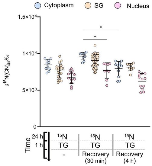 Cells are supposed to recover after ER stress. SGs rapidly assemble to sequester the bulk content of cytoplasmic mRNAs, and dissolve within a few hours upon stress resolution to release stored mRNAs for future translation [16,33,34]. Here, we investigate the dynamics of SG and cytoplasmic protein turnover during the recovery time after ER stress. NPCs were first incubated in a cell medium containing 15N leucine for 24 h, and then in a regular cell medium without the isotopic amino acid for 6 h. Afterward, the cells were stressed with TG for 1 h, followed by a recovery period in which the cells were incubated in regular cell medium. The cells were then selected for chemical fixation at different recovery time-points, i.e., after 0 h (no recovery), 30 min, and 4 h. The fixed cells were labelled for the SG marker G3BP, and further prepared for STED and NanoSIMS imaging. Because of the longer incubation time with 15N leucine, the 15N enrichment is higher (mean δ15N for all time-points = 8589 ± 1031‰) than the samples which were incubated in 15N leucine for 1 h (15N → TG, mean δ15N = 457 ± 134‰).