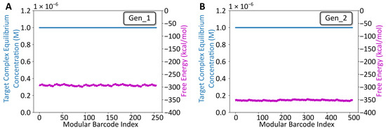 NUPACK Design Analysis. (A) Tube analysis results for the gen_1 library. The x-axis is the modular barcode index, a value assigned to each unique sequence within the library. The left y-axis corresponds to the target complex equilibrium concentration predicted using NUPACK after defining a tube containing the eight oligos at a starting concentration of 1 µM, at room temperature for each barcode. The right y-axis corresponds to the free energy for each barcode complex predicted using NUPACK. (B) Comparable Tube analysis results for the gen_2 library.