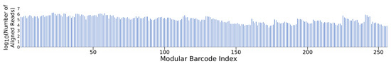 Gen_1 NGS recovery of all 256 modular barcodes. Here, ~80 M joined reads were aligned and assigned using a custom Python script. All barcodes were detected at read quantities ranging from 103 to 106, validating the multiplexing capability provided by the modular barcode design.