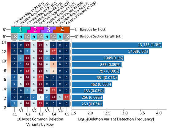While the vast majority of the Gen_1 barcode amplicon reads consisted of full-length reads (80% of the 1 M read data sub-set had a length of 128 bp), the ample amount of data returned in the raw NGS sequencing results was sufficient to reveal relatively rare off-target barcodes. We therefore proceeded to assess the oligonucleotide assembly fidelity during annealing, the first step of modular barcode construction, and found amplicons indicative of off-target assembly events. Figure 4 displays a heatmap of the 10 most common deletion variants detected out of 1 M sequencing reads (Gen_1). The number of missing nucleotides within a given barcode segment ranged from 1 to 14, with the majority of deletion variants missing portions of constant regions 2 and 3 and variable regions 2 and 3 internal to blocks 2 and 3.