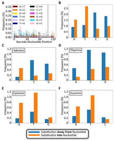 The number and type of 1-nucleotide substitutions were analyzed to determine the extent to which a modular barcode library of low complexity relative to conventional sequencing datasets exhibits substitution errors and trends that coincide with previously published data. As shown in Figure 7A, the positions of 1 nt substitutions were distributed across the entire barcode sequence. The average per-nucleotide substitution frequency, as calculated among all full-length, non-insertion/deletion containing reads, was 0.05 ± 0.04% (Figure S7), slightly lower than a previously reported rate of 0.24 ± 0.06% [24]. The frequency of detected substitution types appeared to be random as well, with the exception of one substitution (T108G) that appeared with an overall frequency approximating 0.38%. We hypothesize that this particular substitution occurred early during library preparation PCR amplification of the barcode, rather than occurring as a random substitution during NGS.