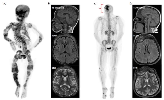 Whole-body 18F-NaF PET/CT and non-contrast craniofacial MRI for Patient 1 at age 23 (A,B) and Patient 2 at age 53 (C,D). (A) There is diffuse radioactive uptake in the axial and appendicular skeleton with pronounced focus in the craniofacial regions indicating polyostotic FD. (B) Craniofacial regions with diffuse FD lesions. Skull-based lesions are highlighted. (C) There is pronounced 18F-NaF uptake in the craniofacial region with limited uptake in the rest of the body. (D) Extensive FD affecting the nasal bones and distorting the structure of the sinus cavity. 18F-NaF PET = 18F-sodium fluoride positron emission tomography, CT = computed tomography, MRI = magnetic resonance imaging, FLAIR = fluid-attenuated inversion recovery, STIR = short tau inversion recovery.
