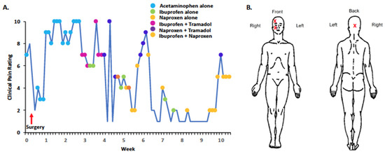 (A) The 12-week daily pain diary completed by Patient 1 while undergoing treatment with denosumab at age 23. Average pain was assessed using a 0–10 numerical rating scale and was initiated before the onset of denosumab treatment. (B) At baseline and using the BPI, anatomical regions where pain was experienced was identified on a body map. Pain was widespread and present in craniofacial and axial–appendicular locations.