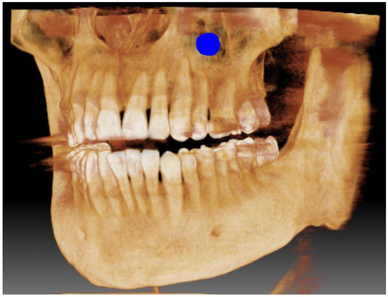 The approximate location of the bone sample on the anterolateral wall of the maxilla (marked in blue).