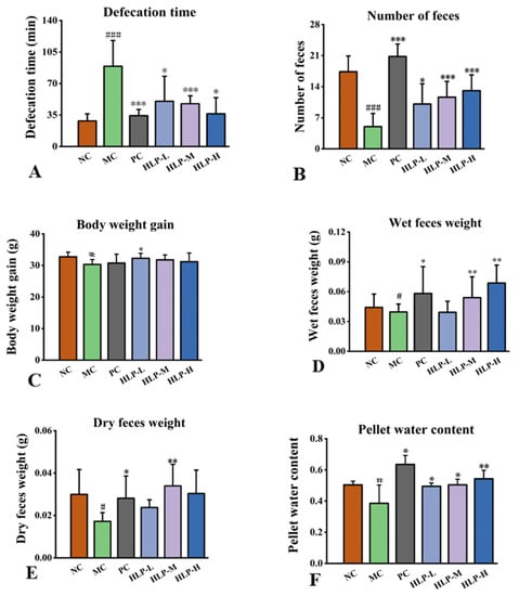 Figure 1. The effects of HLP on the parameters related to defecation in mice. (A) Defecation time. (B) Number of feces. (C) Body weight gain. (D) Wet feces weight. (E) Dry feces weight. (F) Pellet water content. # p < 0.05, ### p < 0.001 vs. NC group; * p < 0.05, ** p < 0.01, *** p < 0.001 vs. MC group. NC: normal control group, MC: model control group, PC: positive control group, HLP-L: low-dosage HLP group, HLP-M: middle-dosage HLP group, and HLP-H: high-dosage HLP group.