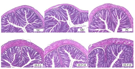 Figure 2. Pathological sections of colon tissue by hematoxylin and eosin (H&E) staining (200× magnification). NC: normal control group, MC: model control group, PC: positive control group, HLP-L: low-dosage HLP group, HLP-M: middle-dosage HLP group, and HLP-H: high-dosage HLP group.