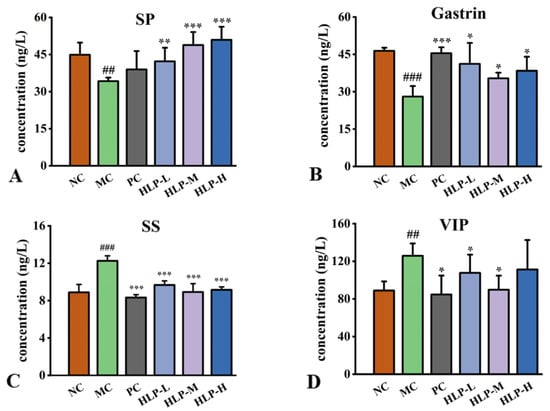 Figure 3. Gastrointestinal regulatory-related peptides content in mice. (A) SP: substance P. (B) Gastrin. (C) SS: somatostatin. (D) VIP: vasoactive intestinal peptide. ## p < 0.01, ### p < 0.001 vs. NC group; * p < 0.05, ** p < 0.01, *** p < 0.001 vs. MC group.NC: normal control group, MC: model control group, PC: positive control group, HLP-L: low-dosage HLP group, HLP-M: middle-dosage HLP group, and HLP-H: high-dosage HLP group.