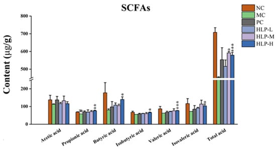 Short-chain fatty acids (SCFAs) are the main intestinal microbial metabolites produced by the glycolysis of colonic flora. This study examined the effects of HLP on intestinal microbial metabolites by measuring the content of acetic acid, propionic acid, butyric acid, valeric acid, isobutyric acid, isovaleric acid, and total acid in each group of mice. In comparison with the MC group, constipated mice treated with HLP had significantly higher SCFA levels (Figure 4, p < 0.05), with the most pronounced effect in the HLP-H group, which significantly elevated the content of almost all acids (propionic acid, butyric acid, isobutyric acid, valeric acid, isovaleric acid, and total acid in the HLP-H group were 76.21 ± 3.12 μg/g, 139.90 ± 14.76 μg/g, 66.25 ± 2.30 μg/g, 76.85 ± 0.92 μg/g, 103.55 ± 10.64 μg/g, and 579.18 ± 15.22 μg/g, respectively, p < 0.05).