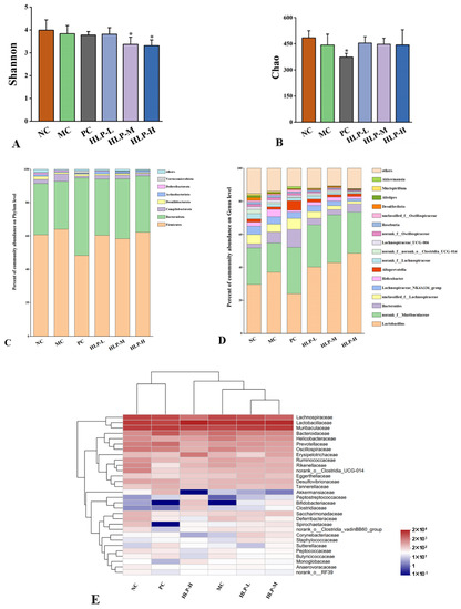 Figure 6. The effects of HLP on microbiota diversity and community structure in mice’s gut. (A) Shannon and (B) Chao estimations of gut microbiota diversity. * p < 0.05 vs. MC group. NC: normal control group, MC: model control group, PC: positive control group, HLP-L: low-dosage HLP group, HLP-M: middle-dosage HLP group, and HLP-H: high-dosage HLP group. Changes of gut microbiota at the (C) phylumand (D) genus level. (E) Heat map comparison between experimental groups at the family level.