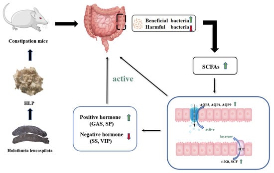 Therefore, HLP treatment modulated the composition of the intestinal microbiota to promote SCFA production, thus stimulating the level of positive hormone, decreasing negative hormone, and upregulating the expression of water channel proteins, SCF, and c-Kit to improve constipation (Figure 7).