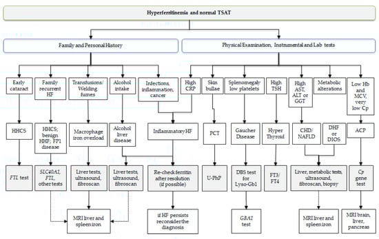 - Aguilar-Martinez, P.; Schved, J.F.; Brissot, P. The evaluation of hyperferritinemia: An updated strategy based on advances in detecting genetic abnormalities. Am. J. Gastroenterol. 2005, 100, 1185–1194. [Google Scholar] [CrossRef] [PubMed]