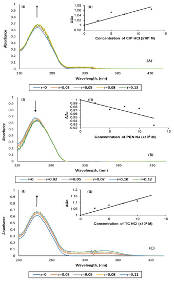 (I) UV spectra of CT-DNA in buffer solution in the absence and presence of (A) CIP·HCl, (B) PEN·Na, and (C) TC·HCl at r values (r = [compound]/[DNA], r = 0, 0.03, 0.05, 0.08, 0.13, and [DNA] = 9.7 × 10−5 M (CIP·HCl), r = 0, 0.02, 0.05, 0.07, 0.10, 0.12, and [DNA] = 10.0 × 10−5 M (PEN·Na) and r = 0, 0.03, 0.05, 0.08, 0.11, and [DNA] = 9.4 × 10−5 M (TC·HCl)) and (II) plot of A/Ao vs. [compound] at λmax = 257 nm (A/Ao = DNA solution absorbance in the presence of DNA-binder (A) and without DNA-binder (Ao)).