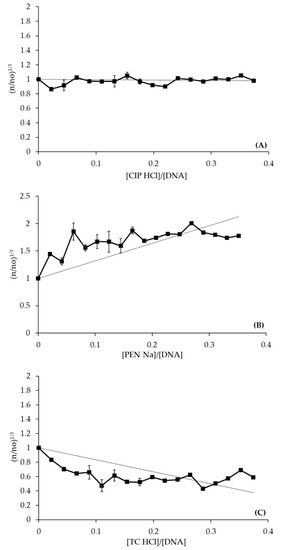 Viscosity measurements: The DNA solution viscosity measurement method determines the interaction of a drug with the DNA molecule as a function of the hydrodynamic changes caused by the binding agent [27]. When DNA is incubated with the antibiotic, its length is altered, and this affects the viscosity of its solution. When an agent intercalates in the DNA strands, it causes an increase in both its length and viscosity. No significant difference in viscosity is observed in the case of electrostatic interaction with DNA. Finally, a decrease in both the length and viscosity of DNA is observed when an agent cleaves its strands or when it covalently binds to DNA causing bending of the helix. Hence, it is shown that viscosity exhibits high sensitivity to changes in DNA and is widely used to determine how a compound binds to DNA [27,28,29]. The correlation between the relative viscosity of the DNA solutions (n/n0) and the length of DNA (L/L0) is given by Equation (2) [27,28].