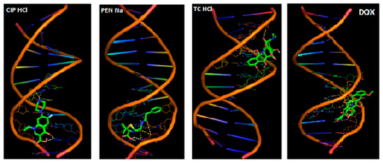 Based on the experimental data on the DNAbinder interaction, the proper poses from those proposed by the docking calculations were chosen. PEN·Na and TC·HCl dock to DNA with a binding energy value of −6.1 Kcal/mol, while CIP·HCl docks with higher binding energy value (−5.4 Kcal/mol). DOX, on the other hand, shows the lowest binding energy value to DNA (−9.4 Kcal/mol). Therefore, among the antibiotics studied, TC·HCl and PEN·Na dock stronger with DNA.
