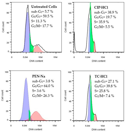 Cell cycle arrest studies were employed in order to confirm the apoptotic type of MCF-7 cells upon their tretment with CIP·HCl, PEN·Na, and TC·HCl, which requires either direct or indirect interaction of DNA with the binders. MCF-7 cells were treated for 48 h with CIP·HCl, PEN·Na, and TC·HCl at their IC50 values, stained with propidium iodide (PI), and the amount of DNA was analyzed by flow cytometry. The results are presented in the DNA frequency histograms as the number of cells versus DNA content in different phases of cell cycle (sub-G1, G0/G1, S, and G2/M) (Figure 5).