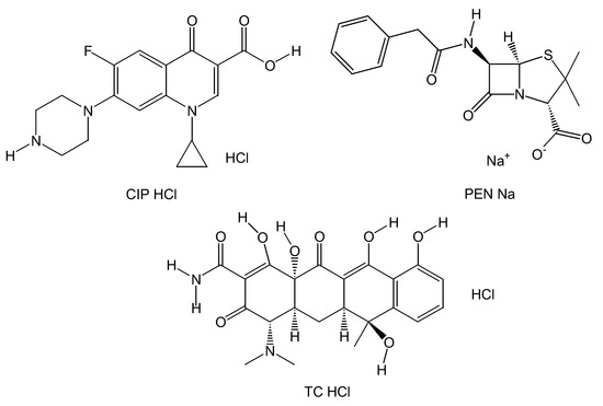Molecular structures of CIP·HCl, PEN·Na, and TC·HCl.