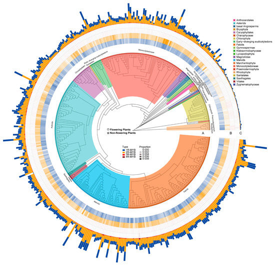 Number of MYB family members in the 437 plant genomes. (A) The phylogenetic tree of the 437 plant species. The tree was colored based on the information of the defined 22 categories, and the color corresponding to each category was shown on top right. Colored circle (for flowering plants) or star (for non-flowering plants) on the tip of each branch represents a species. (B) The four tracks next to the phylogeny show the proportion of MYB subfamily genes in the genome of each species. The tracks from inside to outside are 1R-MYB, 2R-MYB, 3R-MYB, and 4R-MYB. Each MYB subfamily (or track) was shown with a specific color. The values of percentage were divided and shown with different shade indicated in the center of the plot (dark shade means high proportion). (C) The outermost track shows the total number of MYB subfamily members in each genome. Blue represents 1R-MYB subfamily, orange represents 2R-MYB subfamily, red represents 3R-MYB subfamily, and dark red represents 4R-MYB subfamily. Figure was plotted using R package ‘ggtree’ (https://bioconductor.org/packages/release/bioc/html/ggtree.html accessed on 20 May 2022).