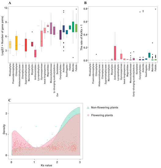 Further, the present study observed the distribution of mean Ks values. From all 437 species, only gene pairs with Ks < 3 were retained, with the exception of all gene pairs with Ks > 3 from two green algae: Chloropicon primus and Auxenochlorella protothecoides (Table S7). The results showed that both flowering and non-flowering plants experienced ancient WGD. In flowering plants, ancient WGD has been reported in the common ancestors of the core eudicots (γ-triplication) [47], magnolias (λ event) [48] and monocots (τ event) [49], whereas WGDs in the ancient lineages of gymnosperms were also identified [50,51]. However, flowering plants have also undergone a recent doubling of MYB genes, which may have been caused by whole-genome duplications that did not occur in non-flowering plants (Figure 3C). We additionally observed a recent peak in Ks values in several non-flowering plants, such as Porphyra umbilicalis, Chlamydomonas eustigma, and Penium margaritaceum (Figure S5). This was consistent with previous studies reporting polyploidization in P. umbilicalis [52] and chromosome-level duplications in C. eustigma [53]. Although the P. margaritaceum genome has not had a recent WGD, substantial segmental gene duplications caused by highly abundant transposable elements (TEs) have been found [54]. These events could have doubled the MYB gene copy number, explaining the recent Ks peak. In summary, the Ks distribution showed the large-scale landscape of duplication events in flowering and non-flowering plants, and most were consistent with previously identified WGD events in a variety of species. These results suggested that MYB gene expansion via genome duplication and polyploidization has provided the material basis of plant evolution, and that widespread WGDs with lineage-specific patterns have contributed to genome complexity and species diversification in flowering plants.