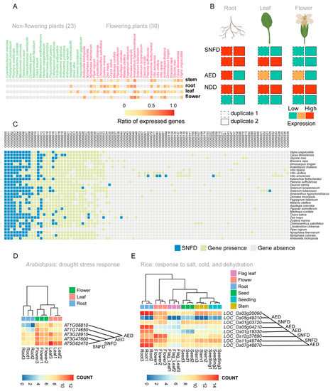 Sub- and neo-functionalization occur after WGD events in plants and can lead to speciation or trait formation. A previous study reported that the MYB regulatory Ruby2–Ruby1 gene cluster exhibits sub-functionalization among primitive, wild, and cultivated citrus as the regulator of anthocyanin biosynthesis [75]. Here, 53 representative plant species from 22 categories were analyzed to explore sub-/neo-functionalization of MYB genes. A total of 444 RNA-seq libraries from multiple tissues in 53 species (30 flowering plants and 23 non-flowering plants) were downloaded from publicly available databases (Table S12). Based on a threshold of reads per kilobase of transcript per million mapped reads (RPKM) > 5, we observed that more genes were expressed in the root, stem, leaf, and flower tissues (Figure 5A and Figure S12; Table S13 on GitHub) compared to other plant tissues. The gene duplicates previously identified within each of the studied plant genomes were further classified into three categories based on their co-expression patterns in different tissues of flowering plants: sub-/neo-functionalized duplicates (SNFD), in which each gene in the duplicate pair was significantly more highly expressed than the other in at least one tissue; asymmetrically expressed duplicates (AEDs), in which one duplicate was significantly more highly expressed than its sister in at least 1/3 of tissues, and its expression was not lower than its sister in the other tested tissues. The remaining duplicates were classified as having no difference (NDD) [76] (Figure 5B). The AED category had the highest ratio in nearly all 30 flowering plants (Figure S13; Table S14), suggesting the presence of a possible substitute or dosage effect in the MYB gene family. Furthermore, we explored the conservation of sub-/neo-functionalized MYB genes in orthogroups from 30 selected flowering species and observed that gene pairs in most orthogroups showed species-specific sub-/neo-functionalization (Figure 5C). Functional annotations showed that gene duplicates belonging to the SNFD and AED categories tended to be involved in biotic/abiotic stress responses, whereas gene duplicates belonging to the NDD category were mainly associated with regulation of basic plant physiological and biochemical activities (Figure S14; Table S15 on GitHub). This suggested that tissue-specific expression of MYB gene duplicates has facilitated local adaptation to different environments by plant species. We also found that gene duplicates involved in responses to environmental factors presented unbiased sub-/neo-functionalization in all of the 30 selected flowering plants (Figure 5C; Table S16).