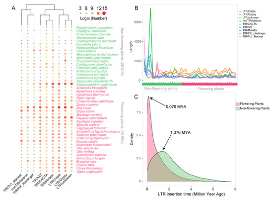 The complex regulatory systems of plants have enabled them to adapt to different environmental conditions continuously and rapidly. Transposable elements (TEs) are the largest component of many plant genomes, comprising ~85% of the wheat genome [83] and ~90% of the corn genome [84]. TEs therefore greatly contribute to the plasticity of plant genomes, influencing the evolution and environmental adaptation of species by generating new genetic variations and cis-acting regulatory elements through controlling the expression of nearby genes and even of unlinked inserted genes [85]. Here, to further explore the causes of sub-/neo-functionalization, we annotated TEs in the genomes of 53 representative plant species from the 22 categories. The results showed that the genomes of non-flowering plants had lower TE abundance (28.31%) and occurrence rates (3.15%) than flowering plants (45.65% and 5.07%, respectively), suggesting that an explosion of TE content occurred in gymnosperms (Figure S16; Figure S17; Table S18). Class II TEs (especially hAT, Mutator, and CACTA) were predominant in the early alga, liverwort, and bryophytes, whereas Class I elements became dominant in Selaginella, hornworts, and gymnosperms, and remained in all flowering plants (Figure 6A). In non-flowering plants, we observed a longer average TE length, although there was a large distribution (Figure 6B and Figure S18). In flowering plants, Class I TEs (LTRs), especially Gypsy, were generally longer than Class II TEs (TIRs) and fluctuated somewhat, whereas the length of Class II TEs tended to be more stable. These data suggested that Class I TEs (LTR) played a dominant role in the morphogenesis and environmental adaptation of flowering plants. An estimation of the TE insertion time indicated that the LTR expansion was relatively recent in flowering plant genomes, around 0.079 MYA, whereas a relatively more ancient LTR expansion occurred in non-flowering plant genomes, around 1.376 MYA (Figure 6C).