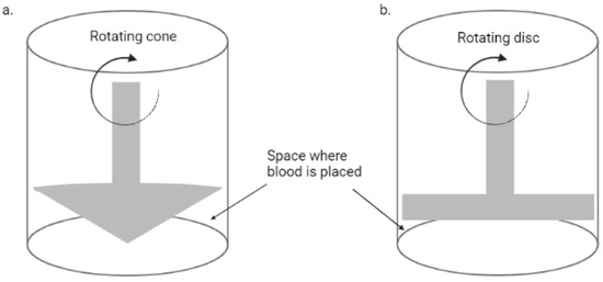 A simplified diagram of a rotational rheometer. (a) Cone and plate rheometer; (b) two-disc rheometer (Created with BioRender.com).