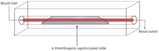 A common approach in designing a flow chamber-based thrombosis model is the perfusion of blood sample over a surface coated with a platelet-activating or thrombogenic agent, as shown in Figure 2, in which collagen is the most commonly used. However, other agents like fibrin, fibrinogen, von Willebrand factor (vWF), and others are also employed [26,27]. Generally, the method involves coating a glass coverslip with the thrombogenic agent, followed by blood perfusion over the coverslip under controlled shear rate, and in some cases the process is monitored in real time [28,29]. Some studies reported the use of cell-free homogenate of atherosclerotic plaque as a thrombogenic agent and were reported to generate in vitro thrombosis through direct activation of platelets; thus, this method can be used as a model for arterial thrombosis and to evaluate novel anti-thrombogenic agents [29,30].