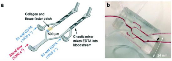 Novel thrombosis-on-a-chip device to measure occlusion time. (a) A schematic illustration of the ‘EDTA-quenched’ device; (b) a photograph of the device. Reproduced from Ref. [33] with permission from the Royal Society of Chemistry.