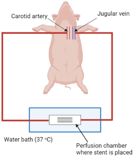 This is a more complicated but commonly used model that combines ex vivo and in vivo approaches. This model employs an extracorporeal perfusion system utilizing stents made from different materials and different morphologies that alter the shear rate of blood flow where the thrombus is developed. Figure 6 shows an illustration of the extracorporeal perfusion system, where stents can be placed in a perfusion chamber inside a water bath and an extracorporeal circuit is surgically utilized by connecting the carotid artery and jugular vein to external tubes, allowing the blood to pass through the perfusion chamber and return back to the jugular vein. Blood flow can be controlled and monitored using a pump and a flow meter connected to the extracorporeal circuit [99] (not shown in the figure).