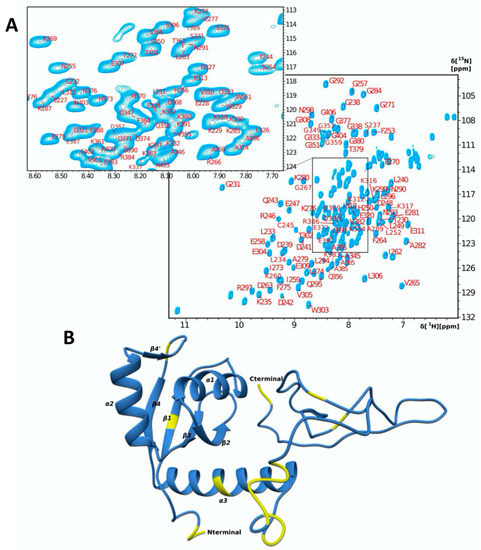 Although the resonance assignment for the La RRM2 is reported in the literature (BMRB accession no 5235), the NMR resonance assignment of a larger polypeptide, which spans the RRM2 and the C-terminal (Cter) segment, is not available. The 1H-15N HSQC spectrum of RRM2-Cter (La 224–408) (Figure 1A) indicates a well-folded protein with a stable tertiary structure in solution. An analysis of the 3D heteronuclear NMR spectra resulted in the assignment of 90% of the backbone nuclei and 62% of the side chain nuclei (Figure 1). All 1H, 15N and 13C chemical shifts of the RRM2-Cter were deposited in the BioMagResBank (http://www.bmrb.wiesc.edu; accessed on 29 November 2022) under accession no. 51713. No backbone amide resonances could be detected for residues M224, S225, L226, F236, E300, I319, R334, R335, F336, K339, G340, K341, G342, N343, K344, F357, A378, D407 and Q408. Most of the unassigned residues are in the C-terminal region of the protein, while M224, S225, L226, F236, E300, I319 and R334 are the unassigned residues of the RRM2 domain (Figure 1B). The fact that most of the unassigned residues are in the structureless and flexible C-terminal region leads to signal overlap in the center of the 1H-15N HSQC spectra (Figure 1A).