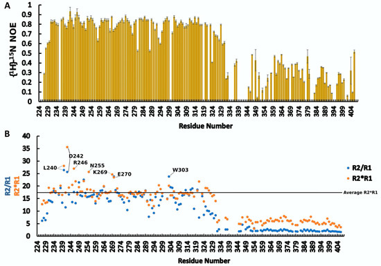 (A) heteroNOE values of RRM2-Cter (La 224–408); (B) R2/R1 and R1 × R2 values of RRM2-Cter (La 224–408). Residues with extremely high values of R1 × R2 and/or R2/R1 are noted.