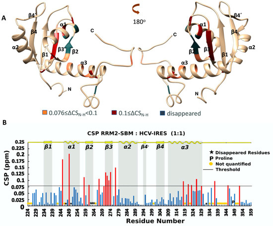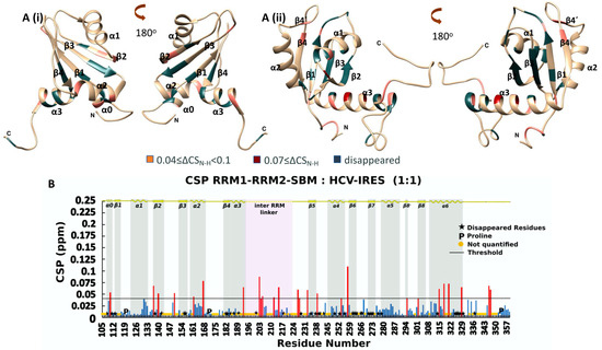 The NMR analysis of the titration between RRM1-RRM2-SBM and HCV-IRES in a 1:1 ratio (Figure 5B) revealed that the CSP values (Equation (1)) of 26 NHs were above the threshold value, which is 0.04 (calculated as described above), and 43 NH peaks disappeared due to the addition of HCV-IRES, with most of the affected NHs belonging to RRM2 residues. Specifically, 20 out of 69 affected residues are located in the RRM1 domain, 7 in the linker between RRM1 and RRM2, and 42 in the RRM2-SBM region (Figure 5A and Figure S9).