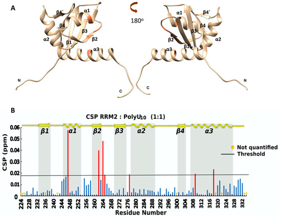 (A) Ribbon representation of the affected amino acids mapped (in orange) into the hRRM2 structure (PDB ID:1OWX); (B) chemical shift perturbation of 15N-hRRM2 upon the addition of the unlabeled ligand in threshold value 0.018. Red bars indicate CSPs above threshold, while blue bars illustrate CSPs beyond threshold line.