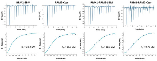 The interactions between the different La domains (RRM2-SBM, RRM2-Cter, RRM1-RRM2-SBM and RRM1-RRM2-Cter) and IRES-HCV domain IV were studied by using isothermal titration calorimetry (ITC) to determine the dissociation constants. Two sets of experiments were performed for each interaction study, titrating the La polypeptides with IRES-HCV domain IV. All the polypeptides containing the RRM2 domain do interact with HCV-IRES RNA (Figure 7). Out of all the La’s polypeptides containing the RRM2 domain, RRM2-SBM displays the highest KD (KD = 28.2 ± 1.21 μΜ, Table 2).