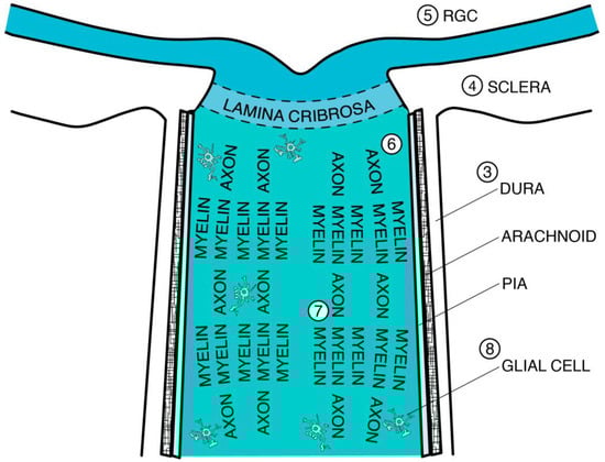 Schematic anatomical image of the optic nerve pertaining to age-dependent neurodegeneration. Numbers correspond with section headings of the present review, specifically “3. Connective Tissue,” which includes “3.4. Dura Mater,” “3.5. Arachnoid and Subarachnoid Space,” “3.6. Pia Mater and Septa,” and “3.7. Lamina Cribrosa (LC)”; “4. Decreased Optic Canal Expansion”; “5. Retinal Ganglion Cell (RGC)”; “6. Axon”; “7. Myelin”; and “8. Glial Cell.”