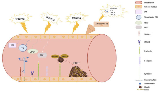 Vascular endothelium homeostasis has been identified as a key player in the fibrinolysis process since endothelial cells produce, regulate, and bind fibrinolytic proteins related to the coagulation process. Importantly, the vascular endothelial growth factor (VEGF) has been studied in endothelium homeostasis due to its role in the permeability of endothelial cells and its function in regulating cell proliferation and migration in endothelial cells, among others [15]. VEGF activates the expression of tissue plasminogen activator (tPA), which is produced in the endothelium, urokinase plasminogen activator, plasminogen activator inhibitor-1 (PAI-1), and the receptor for the urokinase plasminogen activator, which is a key process during the extrinsic and intrinsic coagulation pathway. In addition, the fibrinolysis process may be affected by VEGF, whose low expression reduces the expression of tPA and PAI-1 [16,17,18].