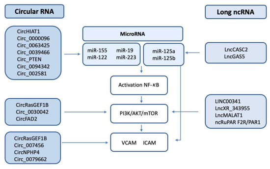 Scheme of the circRNA/lncRNA/miRNA involved in the regulation of NF-κB, the PI3K/AKT/mTOR pathway, and the endothelial adhesion factors VCAM and ICAM.