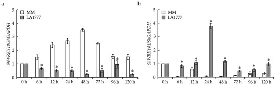 The mRNA accumulation of two WRKY genes in resistant wild tomato LA1777 and susceptible tomato cultivar (MM) following On-lz infection. Quantitative real-time PCR expression analysis of WRKY18 (a) and WRKY81 (b) in tomato leaves at 0, 6, 12, 24, 48, 72, 96, and 120 hpi (hours post inoculation). The glyceraldehyde-3-phosphate dehydrogenase (GAPDH) gene was used as an internal reference. Values are shown as the means ± standard error of three biological replicates, and statistically significant differences in the compatible reaction and incompatible reaction at the same time point are represented by asterisks (Student’s t-test, *, p < 0.05).