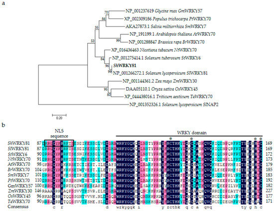 Sequence analysis of the WRKY transcription factor ShWRKY81. (a) Phylogenetic tree of ShWRKY81. The NAC transcription factor SlNAP2 was used as an outgroup. The bar shows 0.2 expected amino acid substitutions per site per branch. Amino acid sequences for comparison were from Glycine max GmWRKY57 (NP_001237619), Populus trichocarpa PtWRKY70 (XP_002309186), Salvia miltiorrhiza SmWRKY7 (AKA27873.1), Arabidopsis thaliana AtWRKY70 (NP_191199.1), Brassica rapa BrWRKY70 (NP_001288847), Nicotiana tabacum NtWRKY70 (XP_016436463), Nicotiana tabacum NtWRKY70 (XP_016436463), Solanum tuberosum StWRKY6 (NP_001275414.1), Solanum lycopersicum SlWRKY81 (NP_001266272.1), Zea mays ZmWRKY30 (NP_001144361.2), Oryza sativa OsWRKY45 (DAA05110.1), Triticum aestivum TaWRKY70 (XP_044438016.1), and Solanum lycopersicum SlNAP2 (NP_001352326.1). (b) Multiple amino acid sequence alignment of ShWRKY81 with other WRKYs mentioned above. The predicted NLS sequence (aa 88 to 98) and WRKY domain (aa 115 to 169) are marked, and the conserved site of C2HC zinc finger motif is highlighted by a star (*).