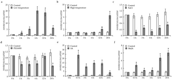 To explore whether ShWRKY81 responded to diverse abiotic stresses, the transcripts of this gene were monitored in 4-week-old LA1777 seedlings treated with low temperature (10 °C), high temperature (40 °C), 200 mM NaCl, and 20% (w/v) PEG6000, respectively. For temperature treatment, the transcripts of ShWRKY81 were markedly induced by low temperature, and exhibited a peak value in accumulation observed at 6 hpt (hours post treatment), ~20-fold higher than that in control seedlings (Figure 4a). The transcripts of ShWRKY81 maintained their basal level at 1–6 hpt, and then were enhanced up-regulated at 12 and 24 hpt compared with the control after high-temperature treatment (Figure 4b). For NaCl and PEG6000 treatments, the transcripts of ShWRKY81 were dramatically decreased compared with the control in both treatments (Figure 4c,d). Taken together, these results indicate that ShWRKY81 was differentially responsive to temperature, salinity, and drought stresses.