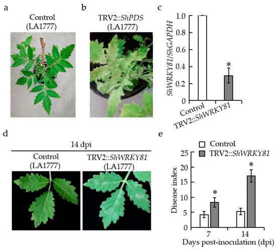 To confirm the role of ShWRKY81 in LA1777 against On-Lz infection, a tobacco rattle virus (TRV)-mediated virus-induced gene silencing (VIGS) system was used to knockdown ShWRKY81 expression in LA1777. Phytoene desaturase (PDS), the marker gene for gene silencing, was used as a positive control to test the VIGS system. TRV2, TRV2::ShPDS, and TRV2::ShWRKY81 constructs were used to infiltrate LA1777 leaves for silencing. At 4 weeks after agroinfiltration, plants infiltrated with TRV2::ShPDS construct displayed a photo-bleaching phenotype (Figure 5b), suggesting the successful induction of VIGS-mediated gene silencing. At this point, all seedlings carrying TRV2 or TRV2:ShWRKY81 constructs were inoculated with On-Lz. In parallel, samples from these seedlings were collected to examine the efficiency of gene silencing by qRT-PCR. As shown in Figure 5c, the transcripts of ShWRKY81 in plants carrying TRV2::ShWRKY81 construct were reduced by ~70% compared with control plants. At 2 weeks after On-Lz inoculation, ShWRKY81-silenced plants showed typical powdery mildew spots (Figure 5d), with significantly higher levels of disease indexes compared with control plants, reaching ~17 (Figure 5e). These results demonstrate that ShWRKY81 is required for On-Lz resistance in LA1777.