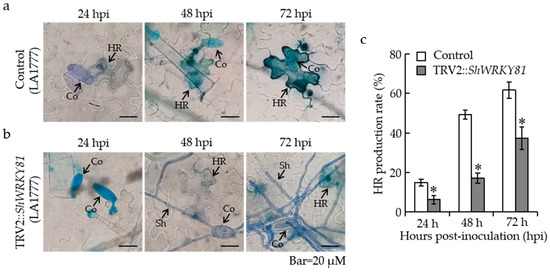 The silencing of ShWRKY81 reduced the generation of HR in LA1777 following On-Lz infection. Histological observation of HR production at infection sites of On-Lz in control (a) and ShWRKY81-silenced LA1777 seedlings (b). Blue staining (trypan) shows the hypersensitive cell death. The HR production rates were calculated at 24, 48, and 72 hpi (c). Co, conidium; Sh, secondary hyphae; HR, hypersensitive response. Bar, 20 μM. Values are shown as the means ± standard error of three biological replicates, and statistically significant differences are represented by asterisks (Student’s t-test, *, p < 0.05).